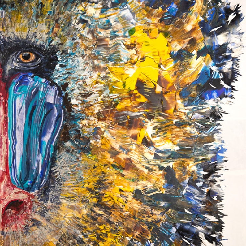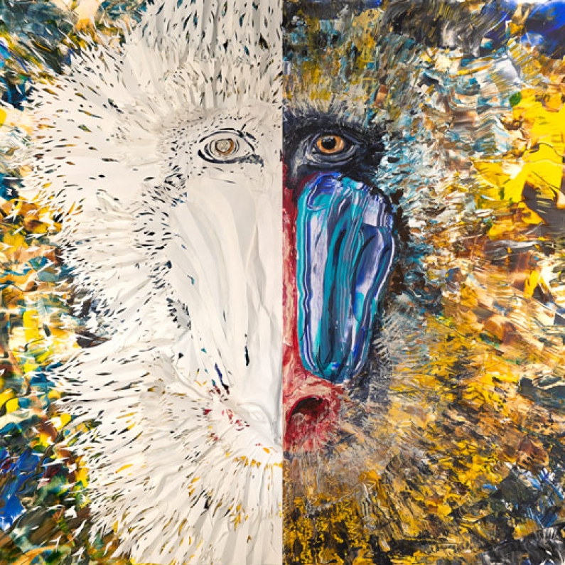 Das Kunstwerk ist inspiriert von einem Mandrill Affen und besteht aus zwei gegensätzlichen „Teilen“, die in Verbindung zu einander stehen.