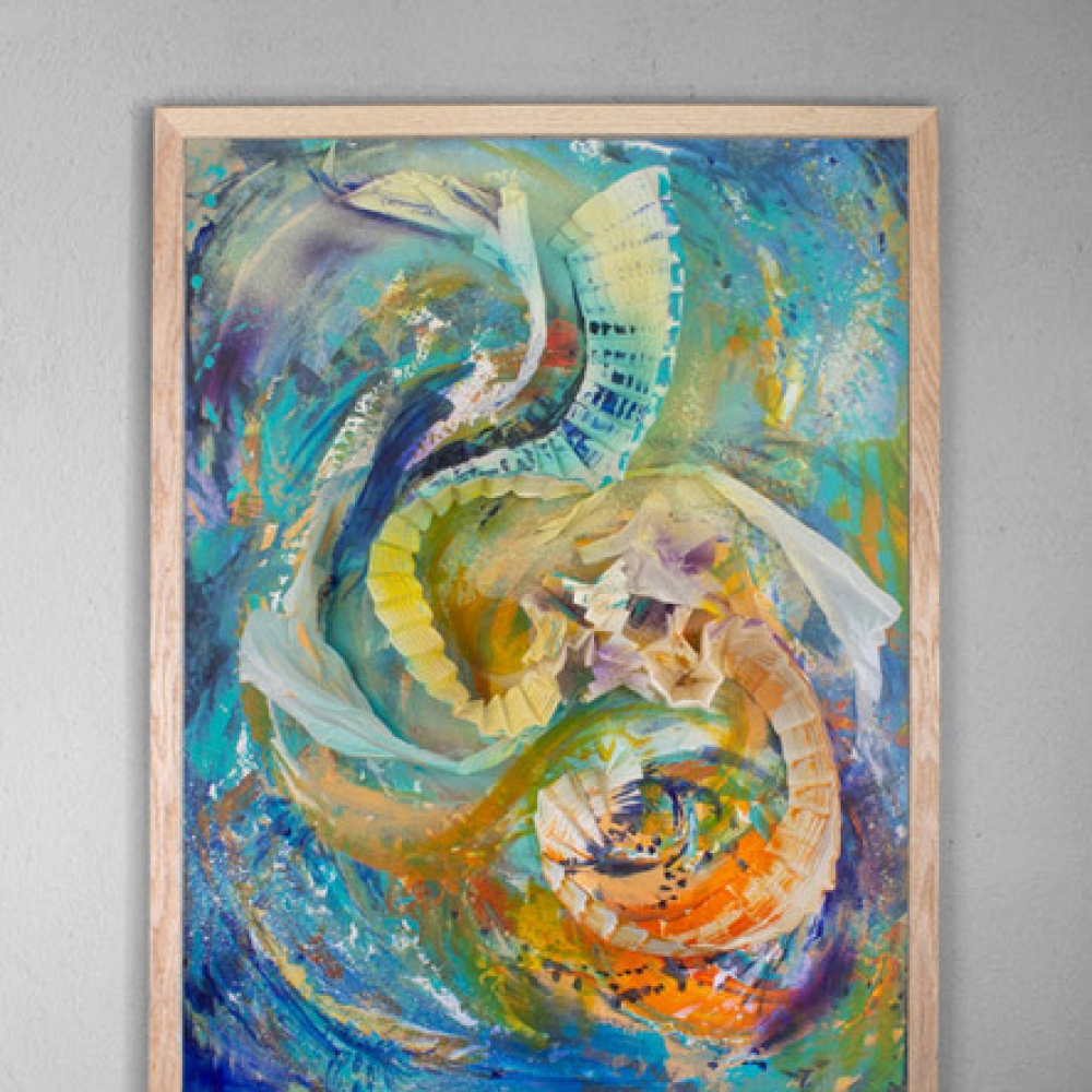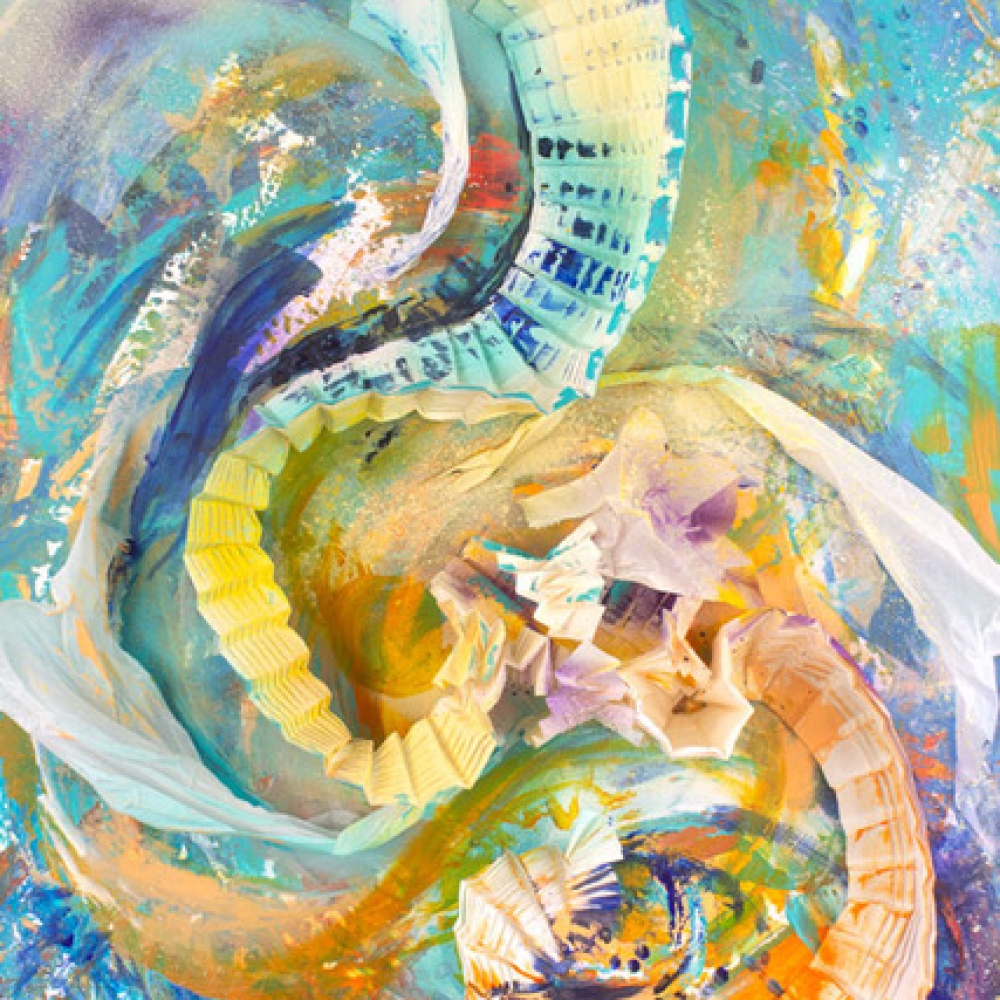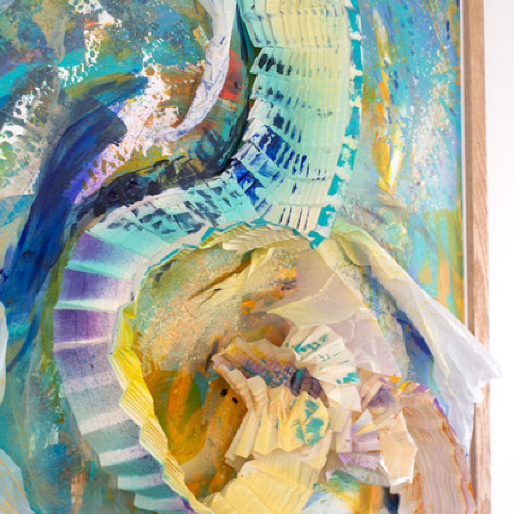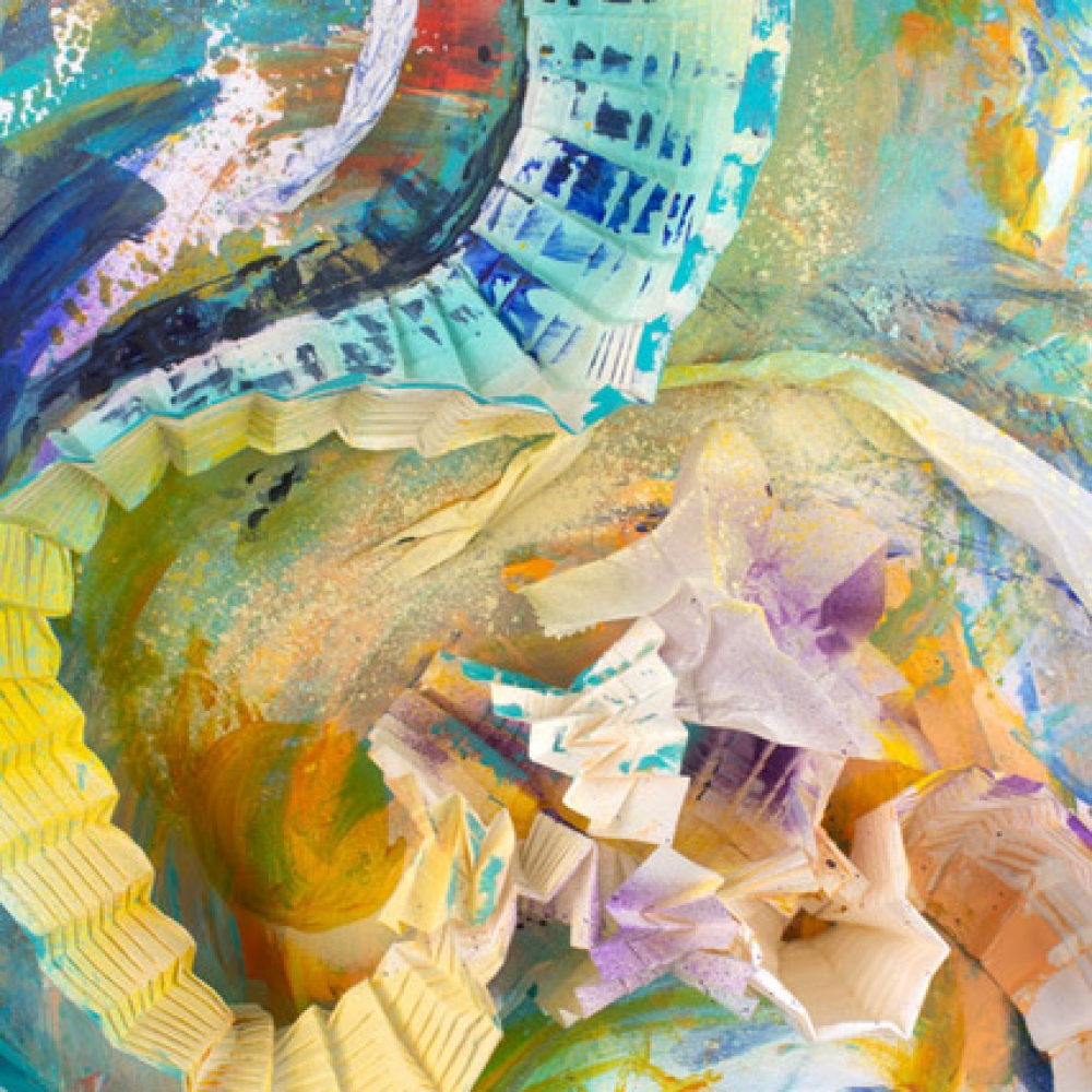 Ein abstraktes Werk, dass die Fantasie anregt. Formgebend sind zwei Papiere die aus sich überkreuzenden Ziehharmonika- und Messerfalten bestehen und ihren Mittelpunkt in einer Faltung mit mehreren Laufrichtungen. Die Farben unterstützen die Schwingungen des Formverlaufs. Die vielen Faltungen und Farbdetails laden den Betrachter dazu ein genauer hinzuschauen.