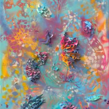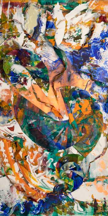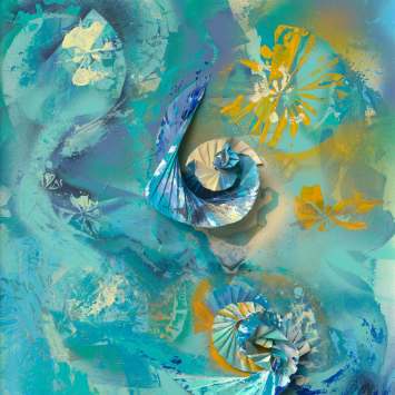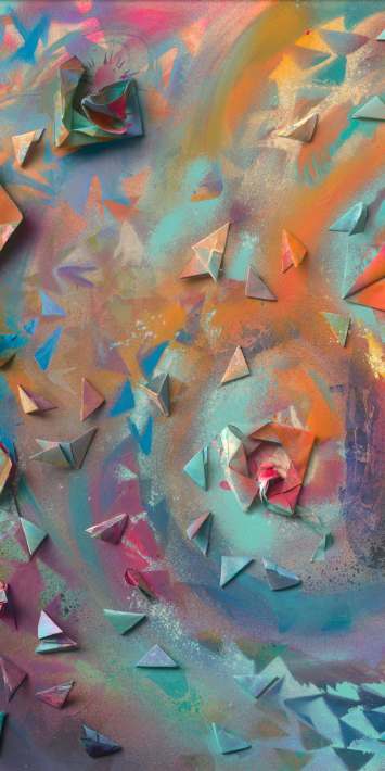 Die Werkreihe „Color in Motion“ verbindet Malerei mit gefalteten Papierstrukturen. Durch Schneiden, Falten und Drehen entstehen reliefartige Formen, die Farbe und Bewegung räumlich erfahrbar machen.