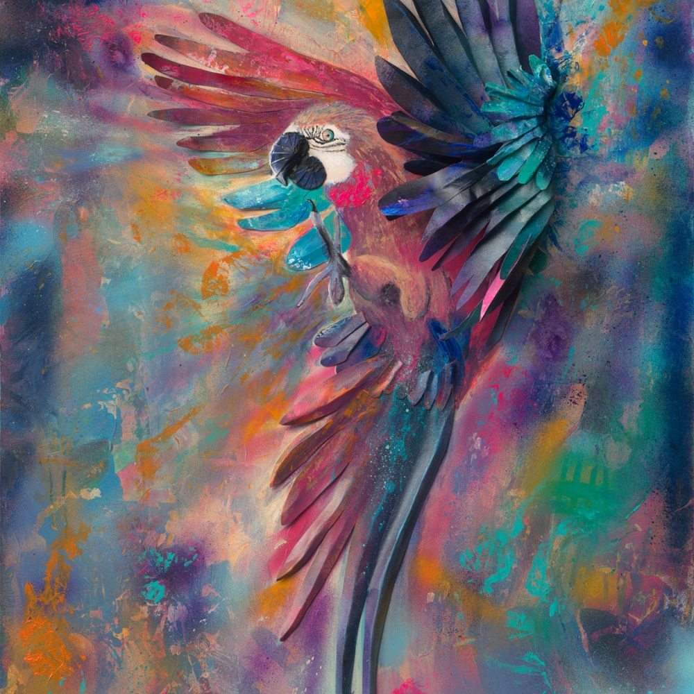 Abanicos (auf spanisch „Fächer“) ist ein farbintensives Werk und zeigt einen Papagei im Flug. Die weit aufgefächerten Flügel sind gefaltetet und erinnern an die Form eines Fächers, daher die Namensgebung. Auch der Schnabel ist gefaltet und besteht aus 3 kleinen Spiralfaltungen die mit einanderverbunden sind. Diese Spiralfaltungen sind auch Teil der Farbgebung und finden sich in mehreren Variationen als eine Art „Abdruck“ im Bild wieder.