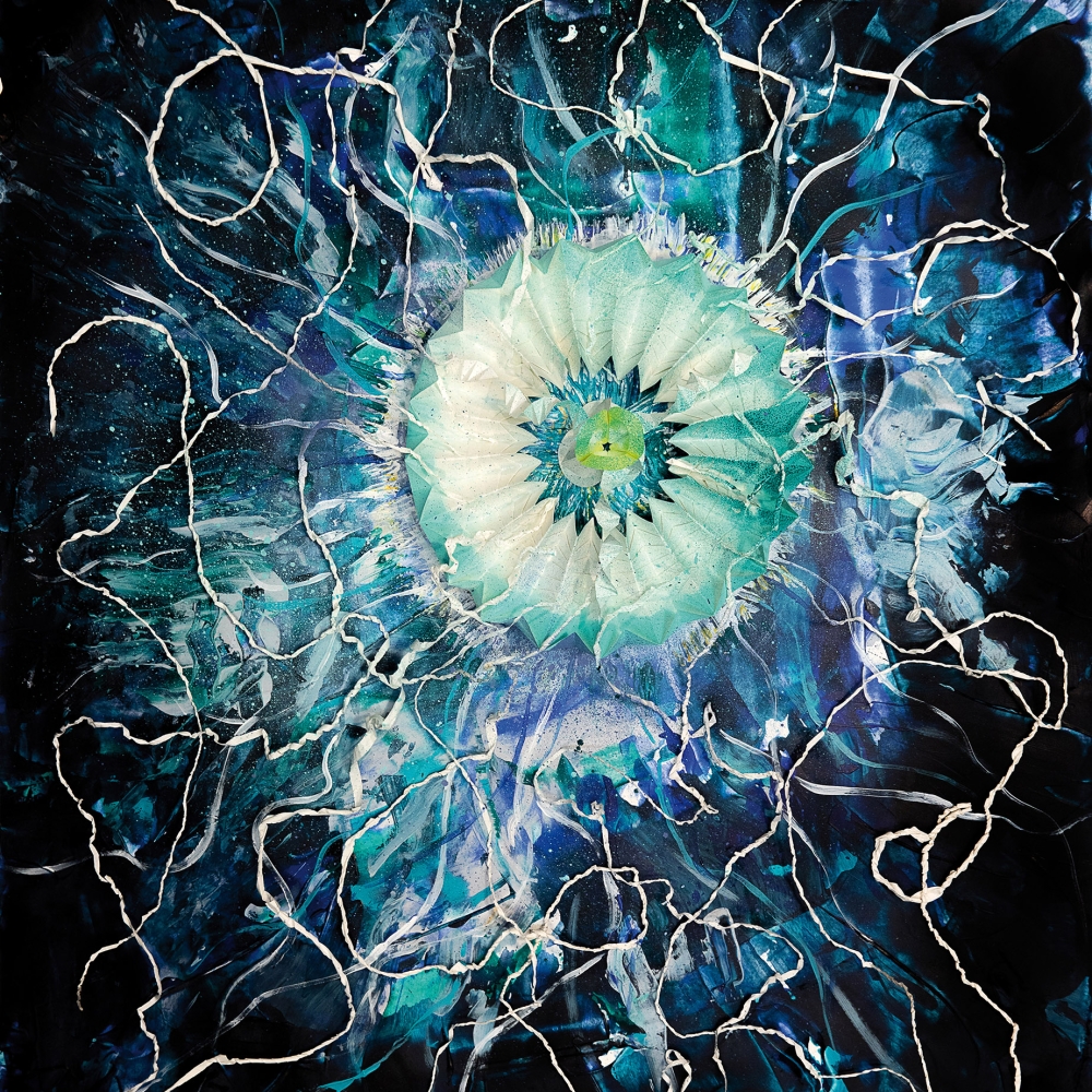 Gedrehte und gefaltete Papierlinien entfalten sich über der Bildfläche und formen ein facettiertes Zentrum aus unterschiedlich gefalteten Elementen. Ein gesprühter Hintergrund bildet die Grundlage der Komposition, die anschließend durch gesetzte Faltungen und Farbakzente vollendet wird.