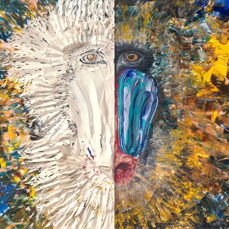 Das Porträt verbindet zwei unterschiedliche Bildsprachen: Die linke Bildhälfte entsteht aus gefaltetem Papier, dessen reliefartige Struktur das Tiermotiv formt. Auf der rechten Seite entwickelt sich das Porträt aus expressiver Malerei und gestischen Farbspuren. So entsteht ein Spannungsfeld zwischen plastischer Papierstruktur und freier, malerischer Oberfläche.