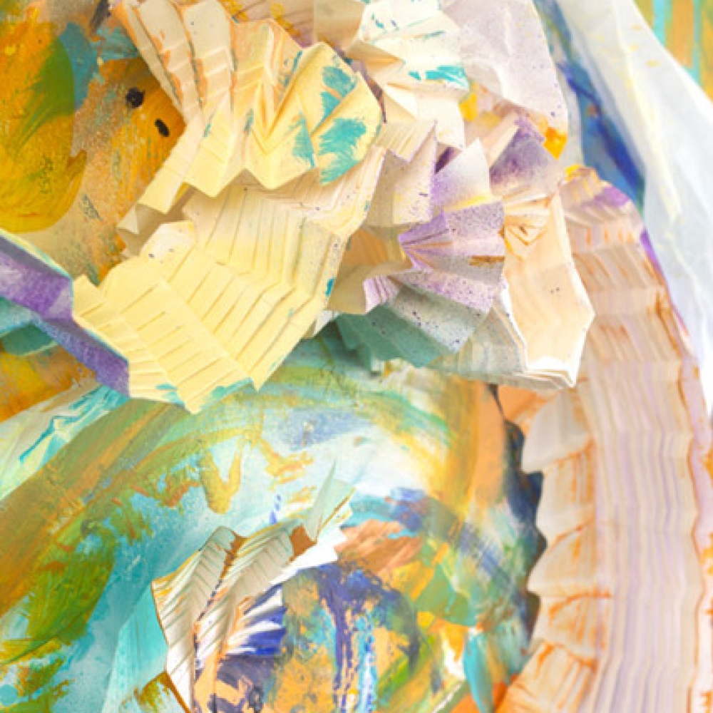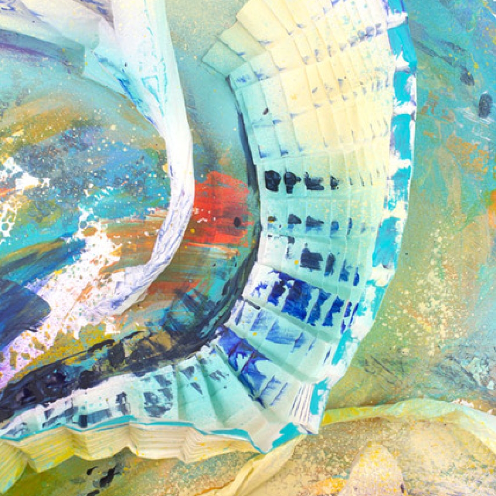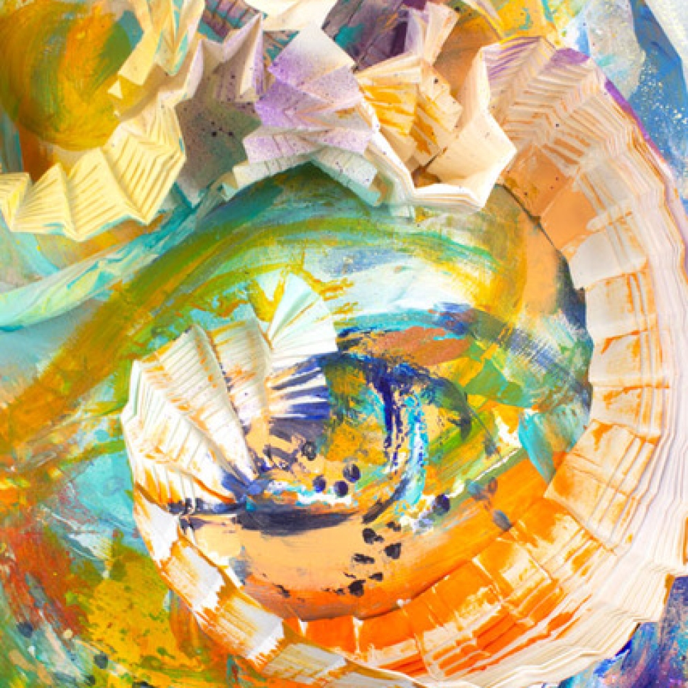 Ein abstraktes Werk, dass die Fantasie anregt. Formgebend sind zwei Papiere die aus sich überkreuzenden Ziehharmonika- und Messerfalten bestehen und ihren Mittelpunkt in einer Faltung mit mehreren Laufrichtungen. Die Farben unterstützen die Schwingungen des Formverlaufs. Die vielen Faltungen und Farbdetails laden den Betrachter dazu ein genauer hinzuschauen.