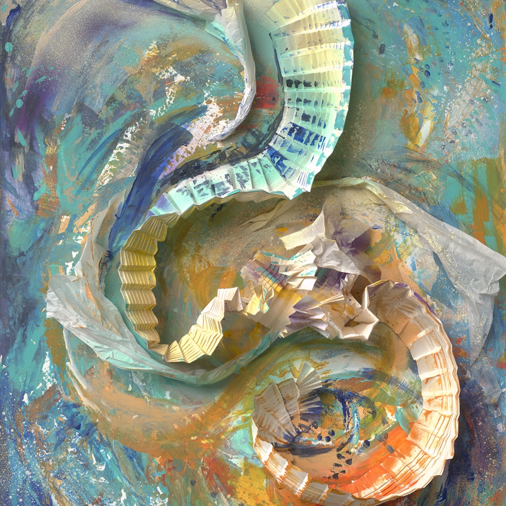 Gedrehte und gefaltete Papierformen entwickeln sich aus einer zentralen Spiralbewegung. Die reliefartigen Strukturen lassen Farbe und Bewegung räumlich erfahrbar werden.